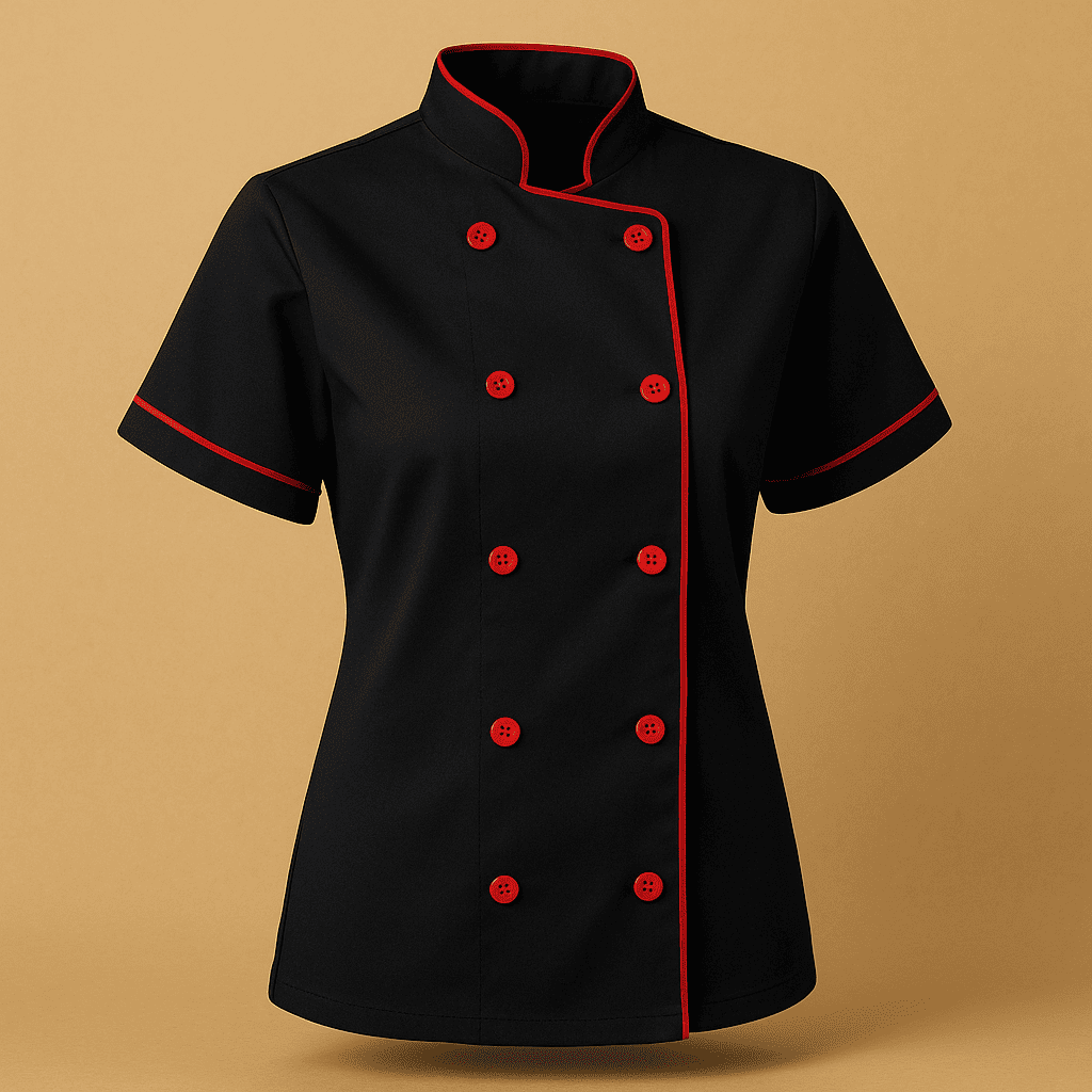 Com seu design moderno em preto com detalhes vermelhos vibrantes, esta dólmã valoriza a silhueta feminina e garante conforto térmico mesmo em cozinhas de alta temperatura.